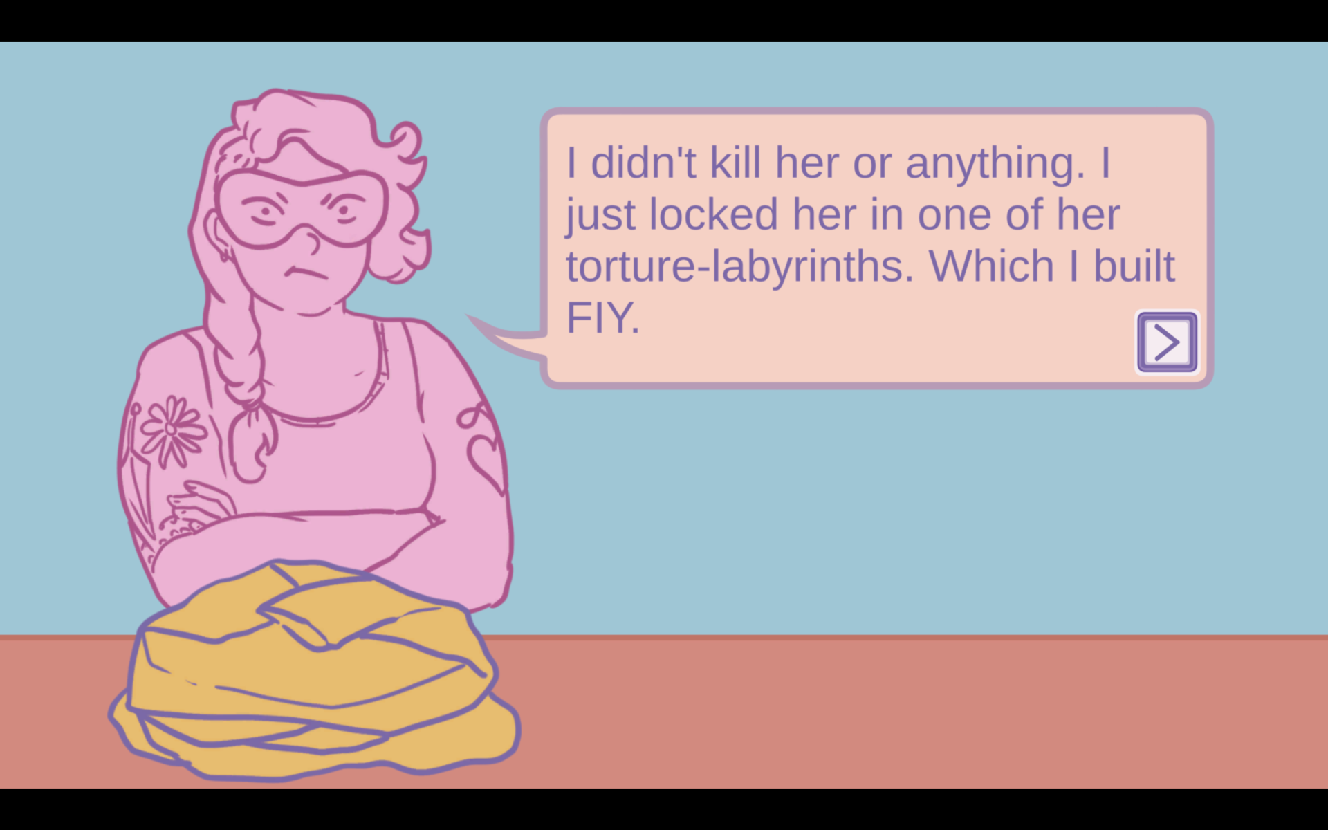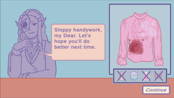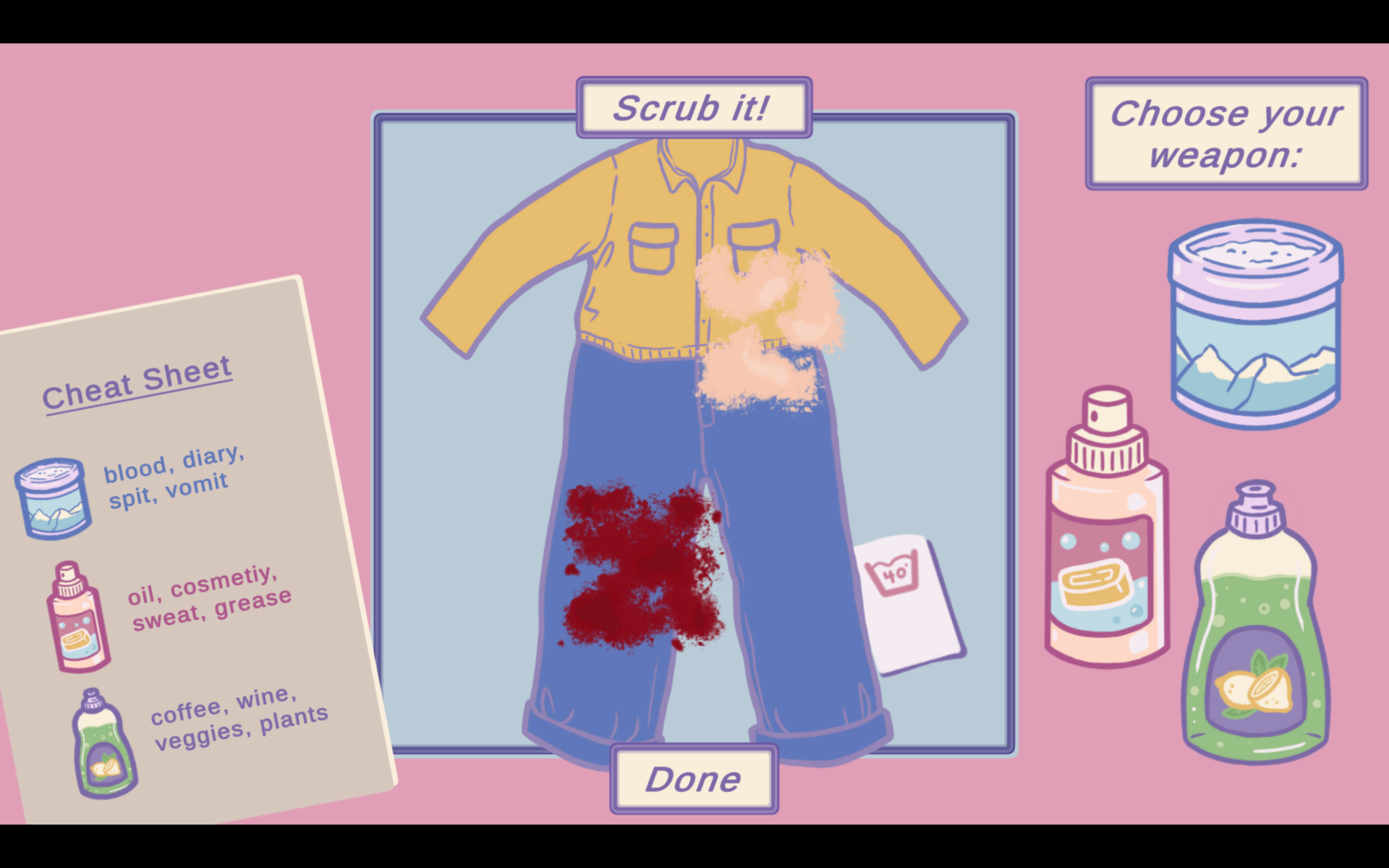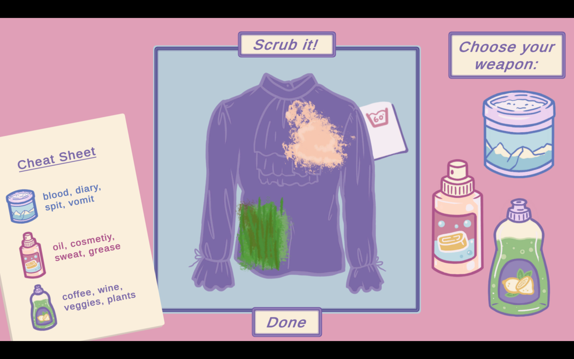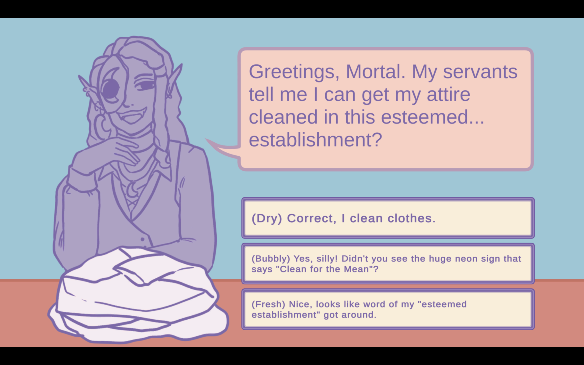 Congrats, you just opened a brand new business! A lovely laundry shop called "Clean for the Mean". In a city full of evil creatures and super villains, it's your job to keep their outfits clean and their expectations fulfilled. Your clients are certified hotties so feel free to try and impress them. There might be a hot date waiting for you at the end.